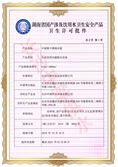 長沙中梁供水設備有限公司已先后通過湖南省衛生廳國產涉及飲用水衛生產品衛生許可批準;